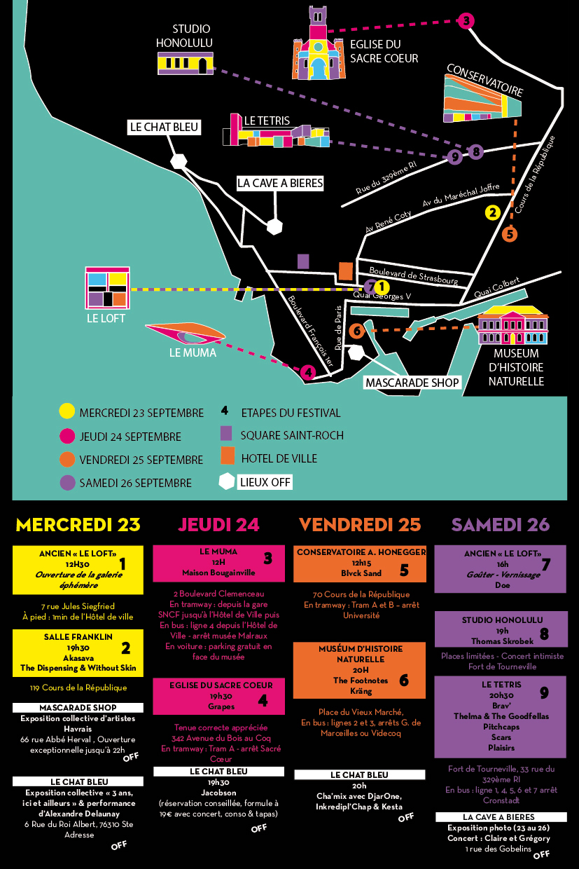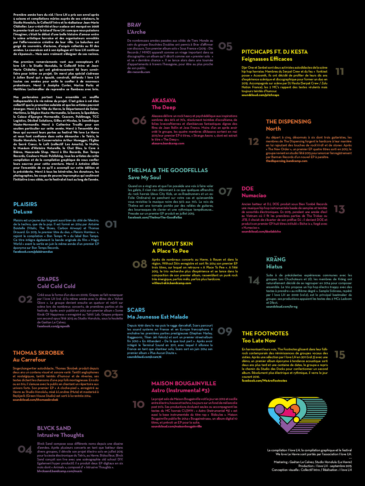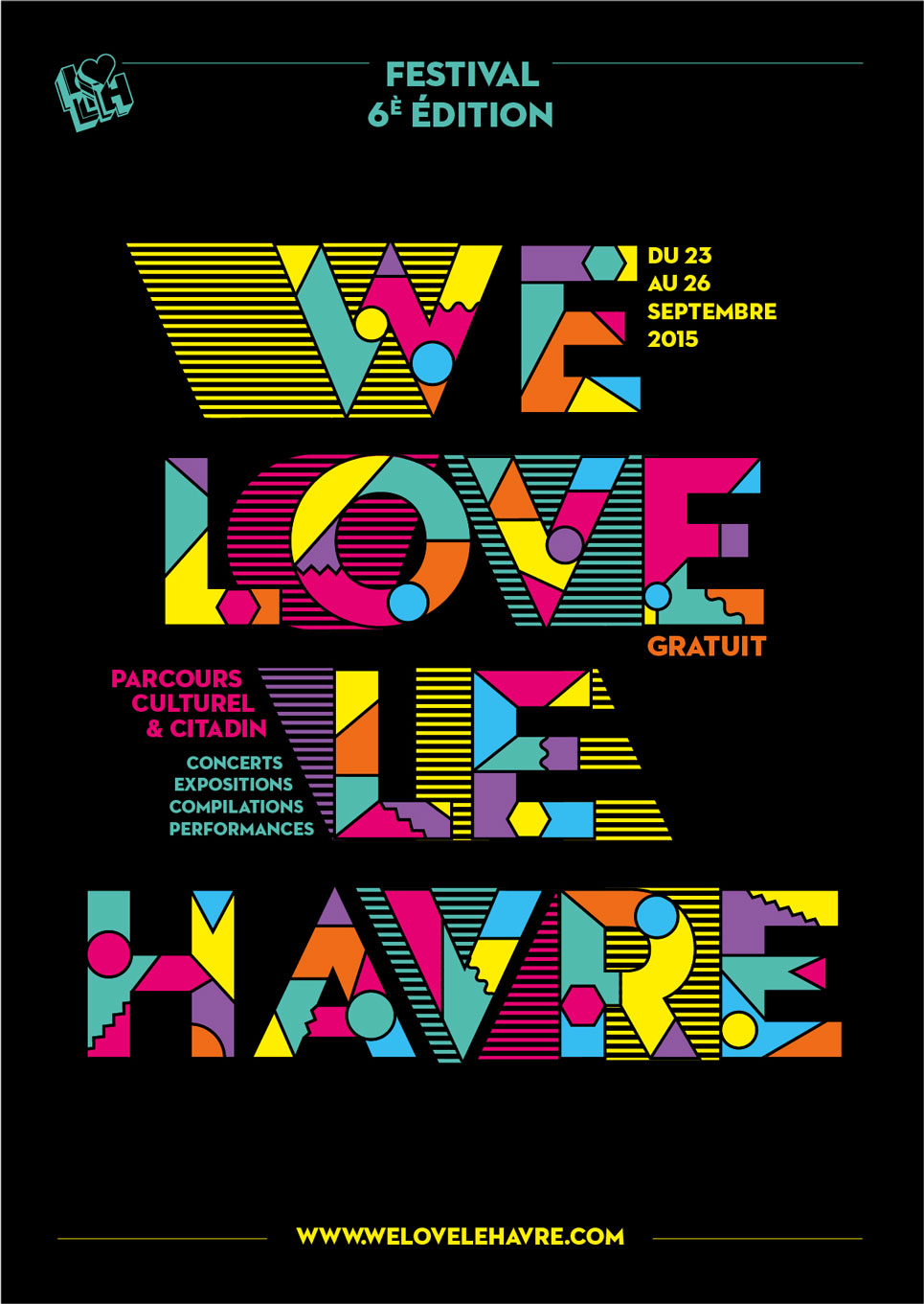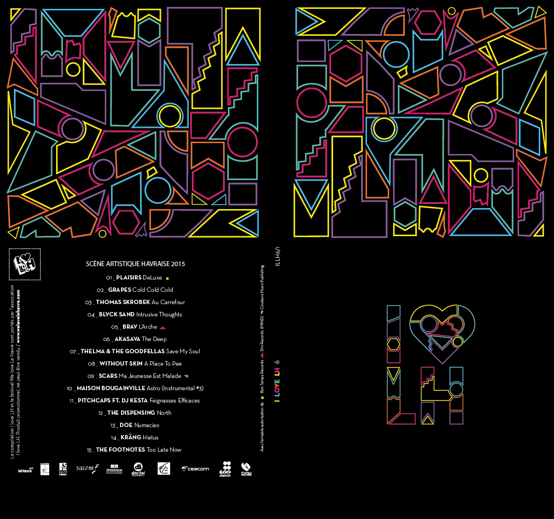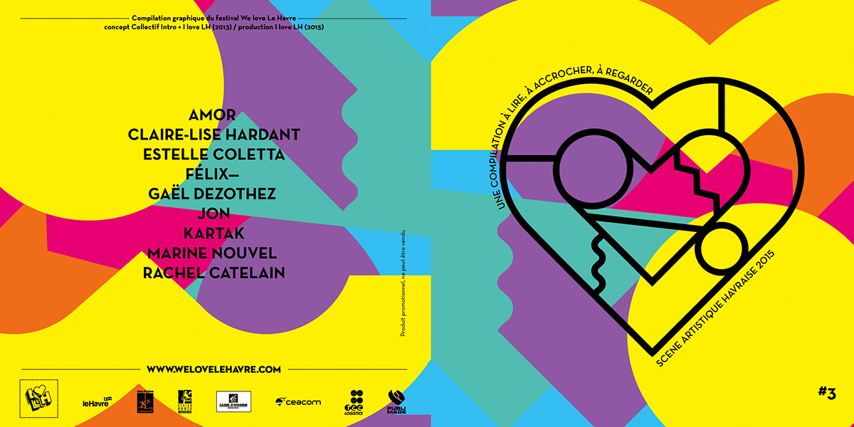 Service Civique en communication pendant une période de 8 mois, j'ai eu le rôle d'appui à la promotion de l'association I Love LH et à la 6ème édition du festival We Love Le Havre. J'ai décliné en différents supports l'identité du festival 2015, créée par le studio Intro : réseaux sociaux, flyers, compilation graphique et musicale, kakémonos, billets, etc.